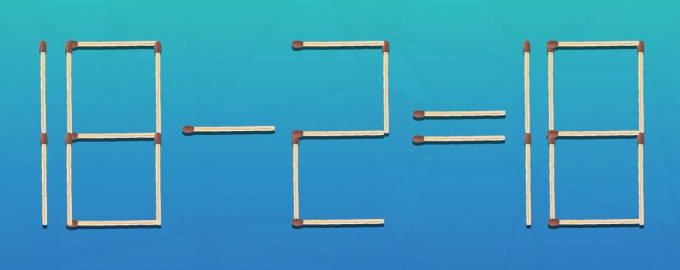 De afbeelding hieronder toont de gelijkheid 18-2=18, gemaakt van lucifers. Het is duidelijk dat het niet klopt. Jouw taak is om slechts één lucifer te verplaatsen om het te corrigeren. En dat moet je doen in slechts 5 seconden.