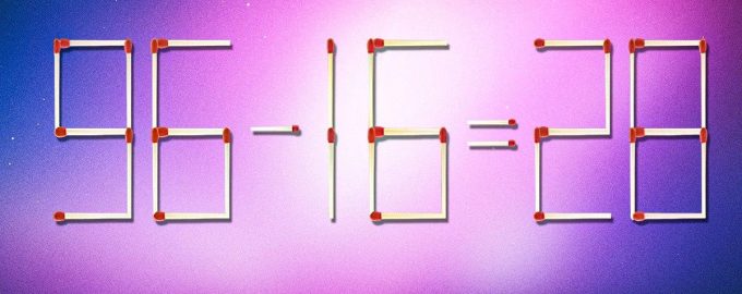 Dus, hieronder zie je de afbeelding, waar lucifers zijn gelegd gelijkheid 96-16=28. Maar het is duidelijk dat er wiskundig gezien iets niet klopt.