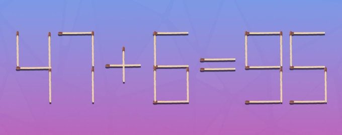 We hebben dus een afbeelding gemaakt waarin lucifers de gelijkheid 47+6=95 leggen. Hier klopt duidelijk iets niet, want het antwoord zou 53 moeten zijn.