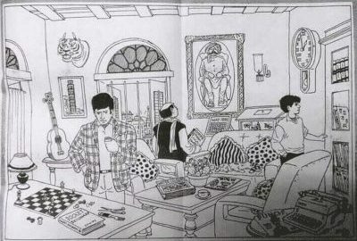 6. Aan de andere kant van de kamer staat een gitaar op een tafel, maar het bovenblad lijkt meer op dat van een sitar.