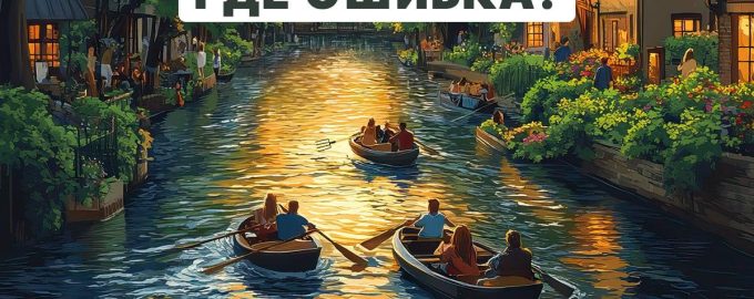 Voor je zie je een foto met een prachtig landschap van een avondlijke stad. Tussen de huizen stroomt een rivier waarop mensen in bootjes drijven. Op het eerste gezicht lijkt de afbeelding normaal, maar in feite zit er een grove fout in.