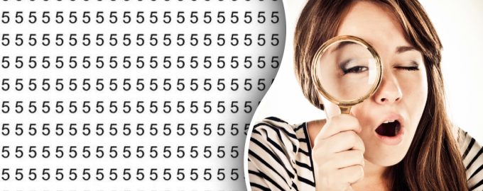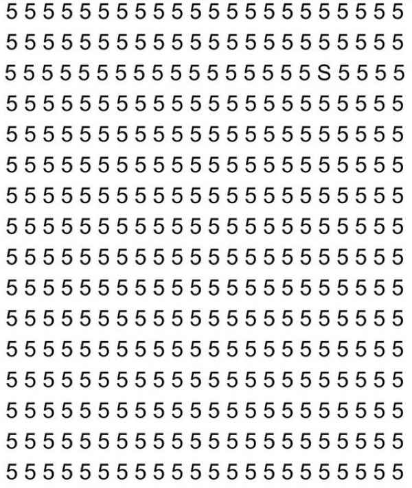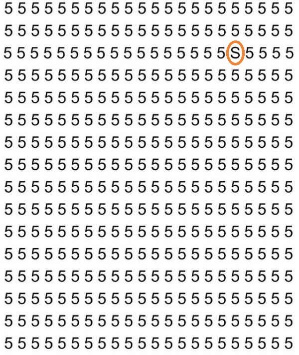 In de afbeelding zien we een heleboel cijfers 5, die in rijen en kolommen zijn gerangschikt. Als je naar deze afbeelding kijkt, kan het vanaf de eerste seconden lijken alsof er absoluut nergens een letter S te vinden is. Maar deze eerste indruk moet je niet vertrouwen – hij is er wel degelijk, het is alleen niet zo gemakkelijk om hem op te merken.